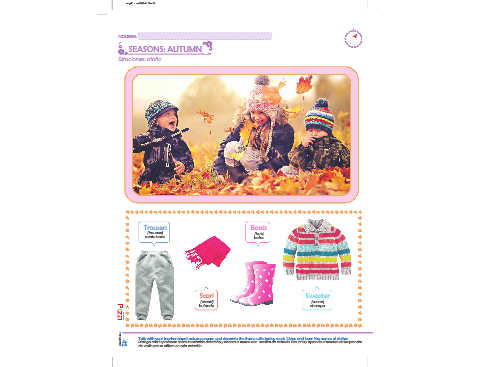 Talk with your teacher about autumn season and decorate the frame with barley seeds. Listen and learn the names of clothes.