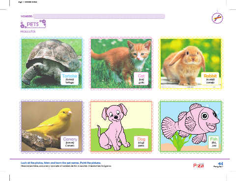 Observa las fotos, escucha y aprende el nombre de las mascotas. Colorear las imágenes. Forty four