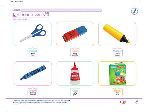 Listen and learn the name of the school supplies. Circle the one you like the most. 4