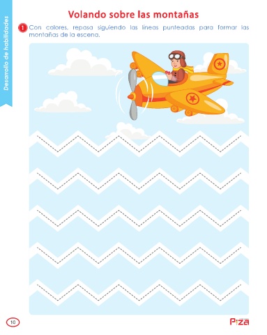 Volando sobre las montañas Desarrollo de habilidades montañas de la escena. 1 Con colores, repasa siguiendo las líneas punteadas para formar las 10 ediciones