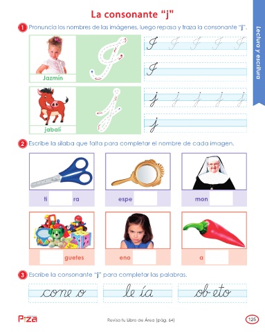1 Pronuncia los nombres de las imágenes, luego repasa y traza la consonante “j”.