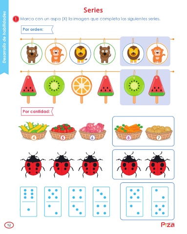 Series Desarrollo de habilidades Por orden: 1 Marca con un aspa (X) la imagen que completa las siguientes series. Por cantidad: 4 5 6 8 7 12 ediciones
