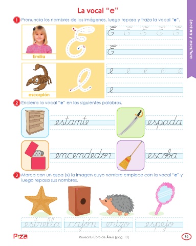 1 Pronuncia los nombres de las imágenes, luego repasa y traza la vocal “e”.