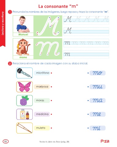 1 Pronuncia los nombres de las imágenes, luego repasa y traza la consonante “m”.