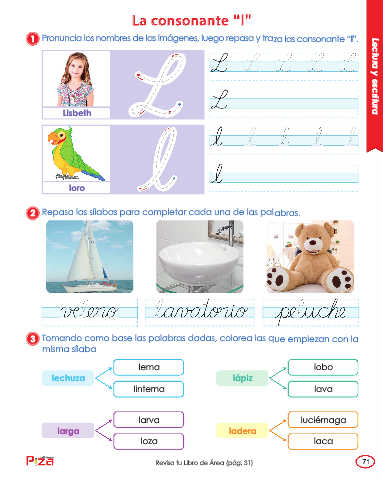 1 Pronuncia los nombres de las imágenes, luego repasa y traza las consonante “l”.
