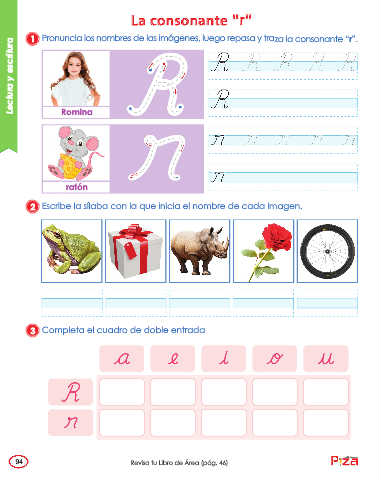 1 Pronuncia los nombres de las imágenes, luego repasa y traza la consonante “r”.
