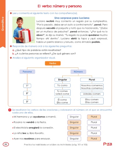 1 Se resaltaron los verbos de las oraciones y colorearon el número en el que se encuentra
