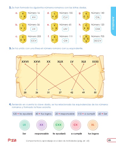 b. L Número 56 e. V Número 65 h. C Número 120 Aritmética