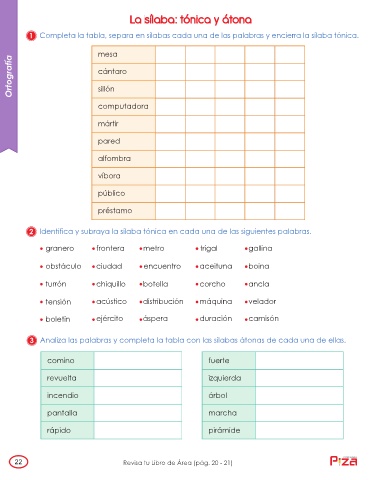 1 Completa la tabla, separa en sílabas cada una de las palabras y encierra la sílaba tónica.