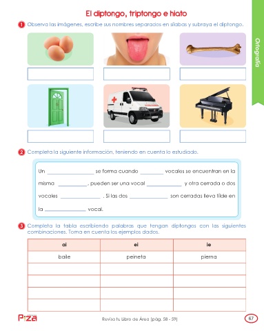 1 Observa las imágenes, escribe sus nombres separados en sílabas y subraya el diptongo. Ortografía