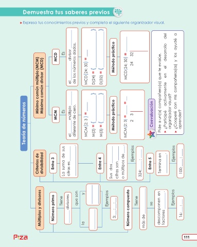 Teoría de números MCM Es el múltiplo diferente de cero. MCM(2; 3 ) = M(2) = { } M(3) = { } Método práctico MCM(2; 3) = = 2 3 Coevaluación ¿Participé organizador visual? ¿Cooperé con mis compañeros(as) aprender?