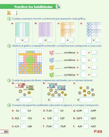 Cuenta y expresa la fracción y el decimal que representa cada gráfico.