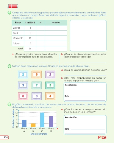 Completa la tabla con los grados y porcentajes correspondientes a la cantidad de flores