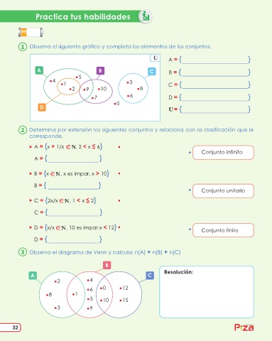 Observa el siguiente gráfico y completa los elementos de los conjuntos.