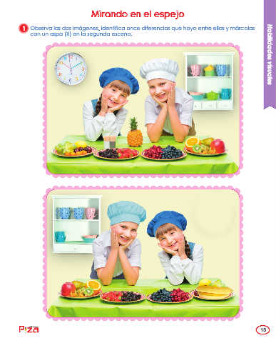 Mirando en el espejo 1 Observa las dos imágenes, identifica once diferencias que haya entre ellas y márcalas con un aspa (X) en la segunda escena. Habilidades visuales ediciones 13