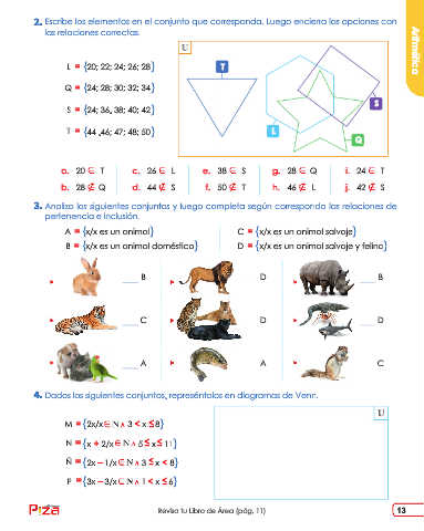 Analiza los siguientes conjuntos y luego completa según corresponda las relaciones de