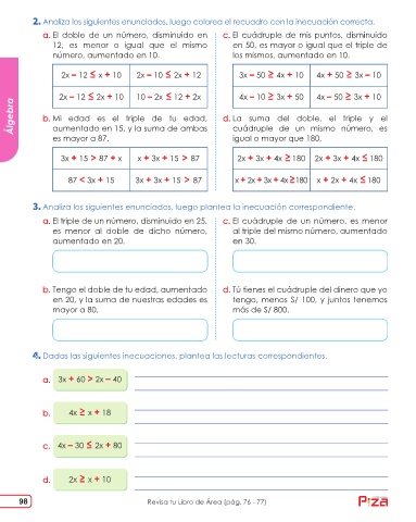Analiza los siguientes enunciados, luego colorea el recuadro con la inecuación correcta.