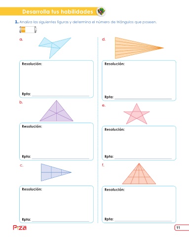 Desarrolla tus habilidades Analiza las siguientes figuras y determina el número de triángulos que poseen. a. d. Resolución: Resolución: Rpta: Rpta: b. e. Resolución: Resolución: Rpta: Rpta: c. f. Resolución: Resolución: Rpta: Rpta: 11 ediciones