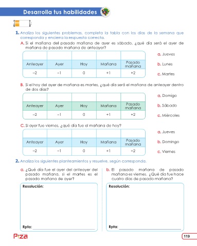 Analiza los siguientes problemas, completa la tabla con los días de la semana que